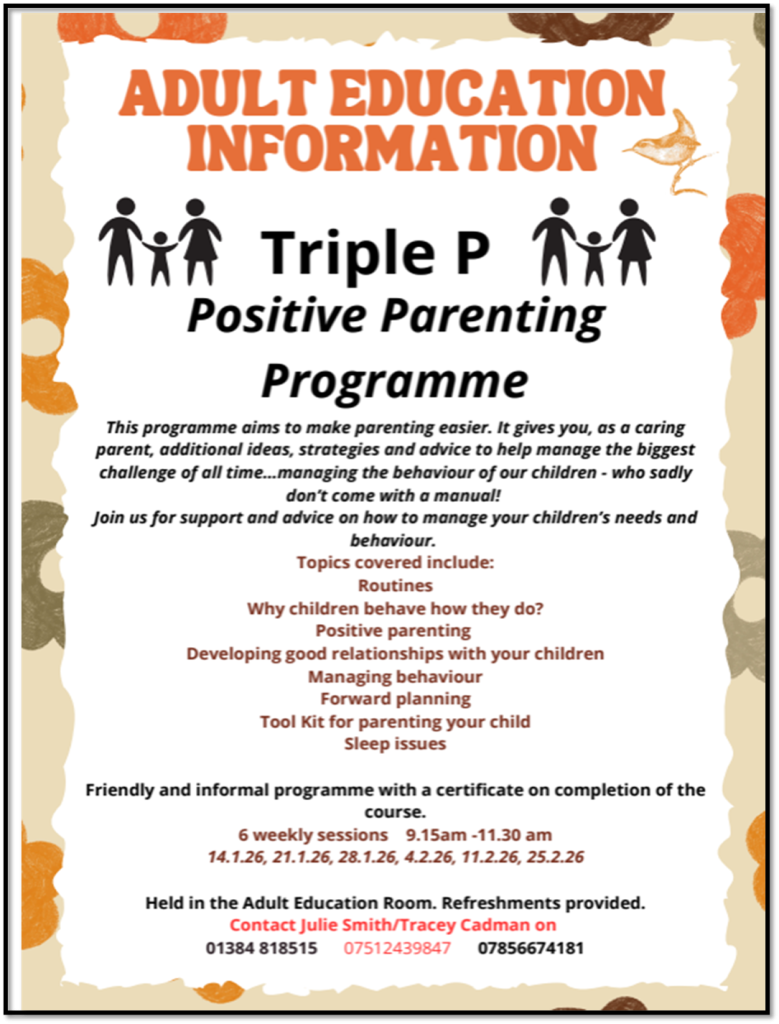 We work closely with Dudley Adult and Family Learning to provide a range of courses and to offer advice and guidance to enable all adults to find out which course meets the individual needs and requirements.
