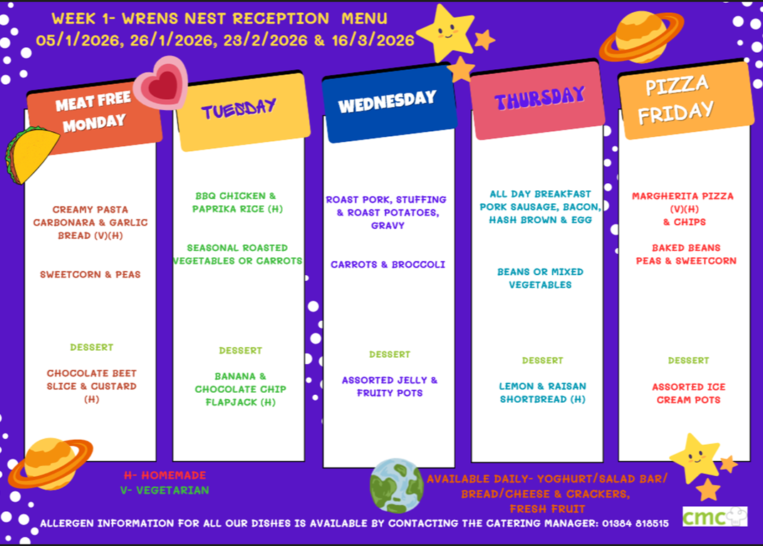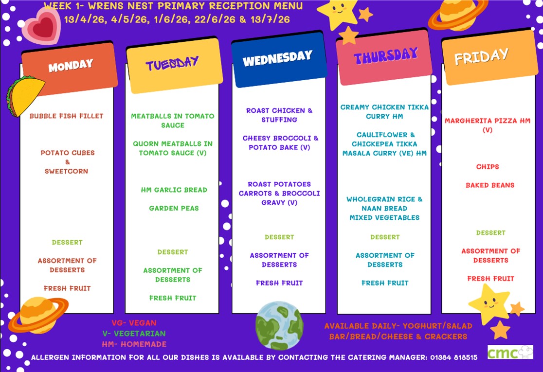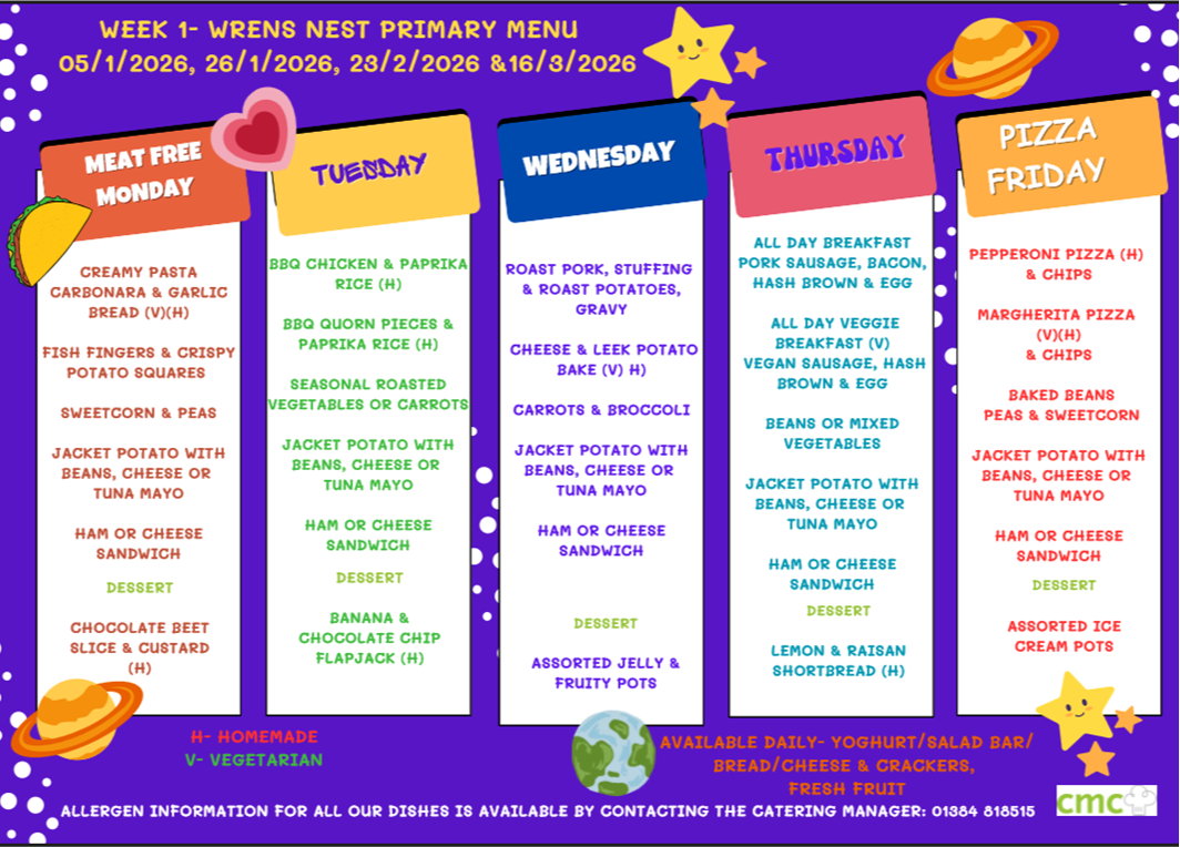 Wren’s Nest has a unique 3 weekly rolling menu which complies with the national food standards and offers a varied and exciting experience for children and staff at lunchtimes. Wren’s Nest is committed to healthy eating and fruit, milk and water are always available at school for children.