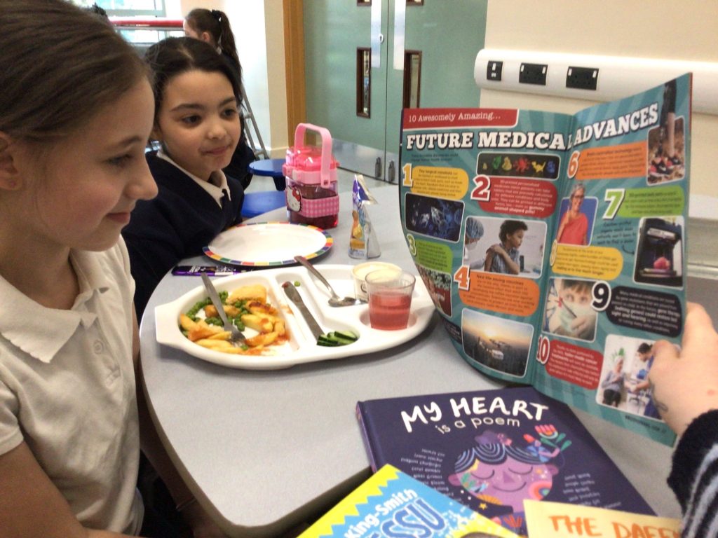 Staff reading in the dinner hall